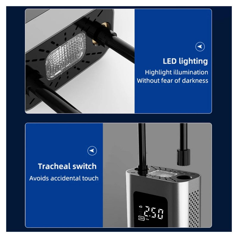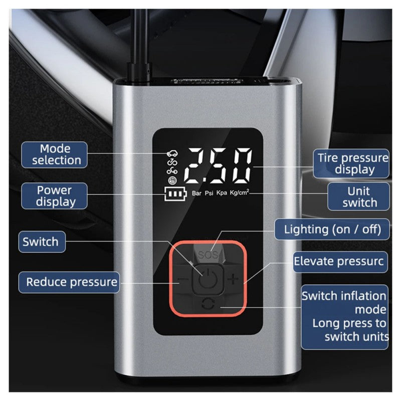 The Sogo Wireless Portable Tire Inflator Pump, a powerful and portable solution for inflating your tires on the go. With its wireless design, this inflator eliminates the need for messy cords and makes it easy to inflate your tires anywhere. With a powerful rechargeable battery, the Sogo Wireless Portable Tire Inflator Pump provides long-lasting performance as a tire inflator and powerbank both. Whether you're stranded on the side of the road or need a quick top-up before a long drive, this inflator has you covered.